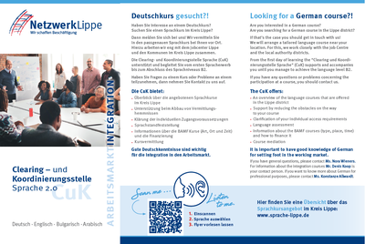 Die Clearing- und Koordinierungsstelle Sprache stellt ihr Angebot in vier Sprachen vor. English, Arabisch und Bulgarisch wurden auf Grundlage der derzeitigen Hauptherkunftsländer der Sprachkursteilnehmenden im Kreis Lippe ausgewählt.