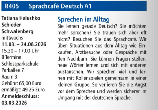 Kostenfreie Deutschkurse. Sie können auch schreiben, lesen und rechnen lernen. Es gibt auch Hilfe für die Vorbereitung auf den Schulabschluss in Deutsch, Mathe und Englisch.